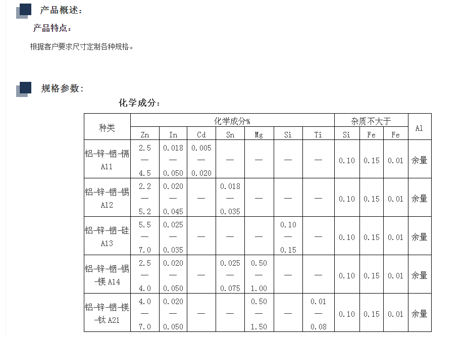 我公司生產的鋁合金犧牲陽極采用優良的原材料(鋁陽極原料純度不低于90%)多重質檢工藝(雜質質檢、金相顯微分析、全套化學分析),